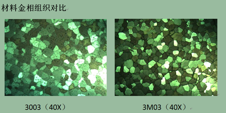 以上将3003、3M03做金相晶粒分析,通过对比,发现3M03合金晶粒度较3003更为细密,这是因为一定含量的Mg元素对晶粒细化产生影响。较为致密的晶粒使材料冲压性能得到有效提升